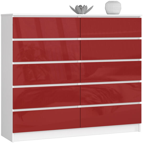 | ai_generic.metadata.description | Modern, 10 fiókos komód fehér korpusszal és magasfényű piros frontokkal. Tartós laminált anyagból, ABS élzárással, görgős fiókvezetőkkel. Ideális tárolási megoldás otthonába. |