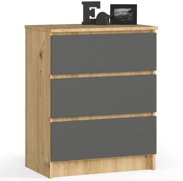 Modern, kompakt komód három tágas fiókkal, amely tökéletesen ötvözi az Artisan tölgy és matt szürke színvilágot. Kiváló minőségű laminált bútorlapból készült, ABS élzárással a tartósság érdekében. Elegáns tárolási megoldás modern otthonokba Ez a stílusos komód tökéletes választás azoknak, akik praktikus tárolási megoldást keresnek modern designnal párosítva. A bútor Artisan tölgy korpusza és matt szürke frontjai harmonikus kontrasztot alkotnak, míg a három tágas fiók bőséges helyet biztosít a tároláshoz. A 16 mm vastag laminált bútorlap és az ABS élzárás garantálja a tartósságot és az ellenállóképességet. A komód kompakt méretének köszönhetően ideális választás kisebb terekbe is, miközben maximális tárolókapacitást biztosít. A fém görgős fiókvezetők sima és csendes működést garantálnak. Előnyök Modern design Artisan tölgy és matt szürke színkombinációval Három tágas fiók maximális tárolókapacitással Kompakt méret, ideális kisebb terekbe isFőbb tulajdonságokAnyagminőség: 16 mm vastag laminált bútorlap ABS élzárássalFiókvezetők: Megbízható fém görgős rendszerÖsszeszerelés: Könnyen összeállítható, részletes útmutatóvalTechnikai adatok Méretek (Sz x Ma x Mé)60 x 77 x 40 cmSúly23,9 kgFiók belső méret51 x 34 cmAnyagLaminált bútorlapGarancia24 hónapVálassza ezt a praktikus és stílusos komódot otthona szépítéséhez!