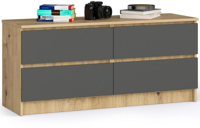 Modern és praktikus komód 4 tágas fiókkal, amely tökéletes tárolási megoldást kínál. Az Artisan tölgy és szürke matt színkombináció elegáns megjelenést biztosít, míg a kiváló minőségű laminált lap tartósságot garantál. Elegáns tárolási megoldás modern otthonokba Ez a stílusos komód tökéletesen ötvözi a funkcionalitást és az esztétikumot. A 120 cm széles bútor 4 tágas fiókkal rendelkezik, amelyek görgős fémsíneken mozognak a könnyű használat érdekében. Az Artisan tölgy korpusz és szürke matt frontok kombinációja modern és időtlen megjelenést kölcsönöz a bútornak. A 16 mm vastag kopásálló laminált lapból készült komód tartós és könnyen tisztítható. A komód kiváló minőségű ABS élzárással készül, amely védelmet nyújt a sérülések ellen és növeli a bútor élettartamát. A fiókblokkoló rendszer extra biztonságot nyújt a mindennapos használat során. Előnyök Tágas tárolóhely négy praktikus fiókkal Modern dizájn Artisan tölgy és szürke matt színkombinációval Tartós konstrukció kopásálló laminált lapbólFőbb tulajdonságokGörgős fémsínek: Könnyű és csendes fiókmozgatásABS élzárás: Fokozott védelem a sérülések ellenFiókblokkoló rendszer: Biztonságos használatTechnikai adatok Méretek (Sz x Ma x Mé)120 x 55 x 40 cmFiók belső mérete51 x 34 cmAnyagvastagság16 mmSúly35,7 kgFiókok száma4 dbVálassza ezt a praktikus és stílusos komódot otthona tökéletes kiegészítőjeként!