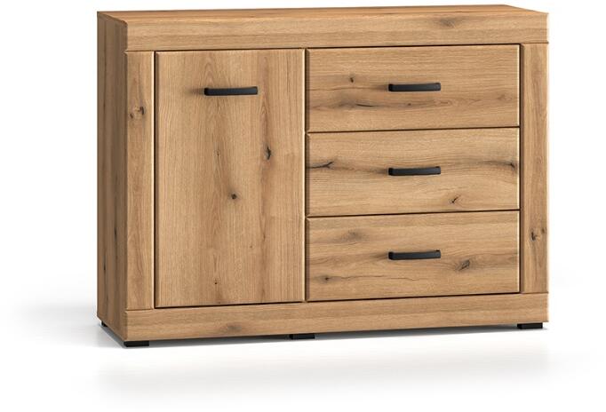 DARIA 05 komód A DARIA kollekció azoknak készült, akik stílusos nappalit keresnek eleganciával és kényelemmel . A DARIA 05 fiókos szekrény finoman lekerekített szettai, a natúr Evoke Oak dekor és a diszkrét fekete részletek harmonikus egészet alkotnak, amely egyszerre modern és otthonos. A kiváló minőségű kidolgozás és az átgondolt részletek kombinációja nemcsak szépséget, hanem kényelmet is visz a mindennapokba. A fiókos szekrény praktikus fiókokkal, egy ajtóval és egy belső polccal rendelkezik. MDF ABS műanyag fogantyúk fiókok teljes kihúzása A DARIA fiókos szekrény kiváló minőségű anyagból készült, amely ellenáll a sérüléseknek, a nedvességnek és a magas hőmérsékletnek. Az ABS él nem hámlik és nem deformálódik. Az esztétikai megjelenés mellett a bútor praktikus megoldásokat is kínál, a fiókok golyóscsapágyakkal vannak felszerelve, amelyek biztosítják a sima működést és a teljes kihúzást. A műanyag fogantyúk ergonomikusak. A zsanérok lágyan záródó funkcióval rendelkeznek. A