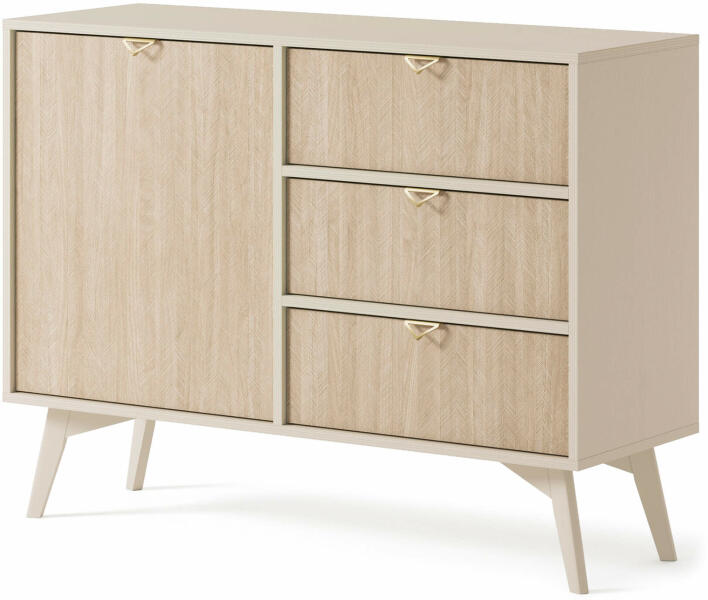 A Forest komód skandináv stílusban készül és ötvözi az eleganciát az egyszerűséggel. A bézs színének és a halszálka mintának köszönhetően igazán lenyűgöző látványt nyújt. A komód számos tároló helyet biztosít a 106 centiméteres hosszúságával. A komód jobb oldalában három fiók található, míg a bal oldalán az egyajtós szekrény ajtaja mögött egy praktikus polcot helyeztek el. Ez a modern és szép komód nem hiányozhat egyetlen otthonból sem.