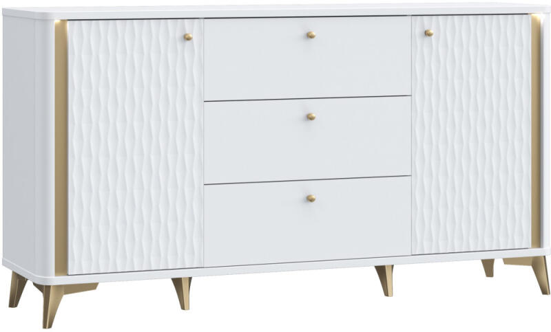 Egy óriási tálalószekrény nappalikba, hálószobákba vagy előszobákba, gyönyörű fehér és arany díszítőelemek kombinációjában. A fiókos szekrény lekerekített sarkokkal rendelkezik a kellemes, lágyabb megjelenés érdekében, és három részre van osztva. A felső lapja akár 20 kg súlyt is elbír. A bal és jobb oldalon profilos ajtókkal ellátott szekrények találhatók, mindegyikben egy fix belső polc található, amely két különálló részre osztja a belső teret, és egyenként 15 kg súlyt is elbír. A felső rész 33,7 cm magas és 35 cm mély, míg az alsó rész 35,7 cm magas és 37,3 cm mély. Mindkét rész 38,6 cm széles, és mindkét szekrény azonos belső méretekkel rendelkezik. A fiókos szekrény középső részében három egyforma nagyságú fiók található fém síneken. A fiókok 12,6 cm magasak és 57,7 cm szélesek, és akár 5 kg súlyt is elbírnak. A szekrények és a fiókok fogantyúi arany színűek. A teljes fiókos szekrény 12 cm magas, arany színű fémlábakon áll.