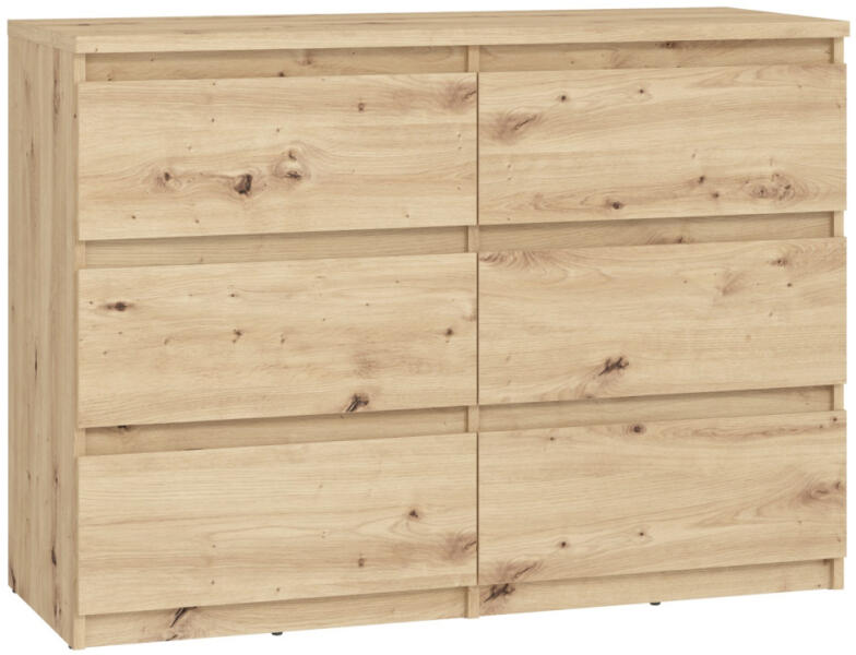 Egy nagyméretű, hatfiókos, fogantyú nélküli tálalószekrény, matt fehér vagy tölgyfautánzattal, amely a ház vagy a lakás bármely helyiségébe illik. Hat egyforma, golyóscsapágyas síneken elhelyezett fiókkal van felszerelve, amelyek elegendő helyet biztosítanak ruhák, kiegészítők vagy háztartási cikkek tárolására. A tálalószekrény kiváló minőségű forgácslapból készült, melamin bevonattal a karcolások és foltok elleni védelem, valamint a könnyű karbantartás érdekében. A belső tér rengeteg helyet kínál, és lehetővé teszi, hogy mindent kényelmesen és rendezetten tároljon a ruháktól kezdve az otthoni kiegészítőkig. A fiókos szekrényt használhatja a nappaliban, a hálószobában vagy akár a folyosón is, mivel praktikus tárolási megoldást kínál bármely helyiségben. A felső panel nagyszerű helyet biztosít fényképek, lámpák, ünnepi ajándéktárgyak és egyéb dekorációk kiállítására. A jó stabilitás érdekében falra kell szerelni a vásárláshoz mellékelt tartozékokkal. Fiókonként maximális teherbírása 5 kg, a fiókos szekrény felső paneljének maximális teherbírása pedig 40 kg.
