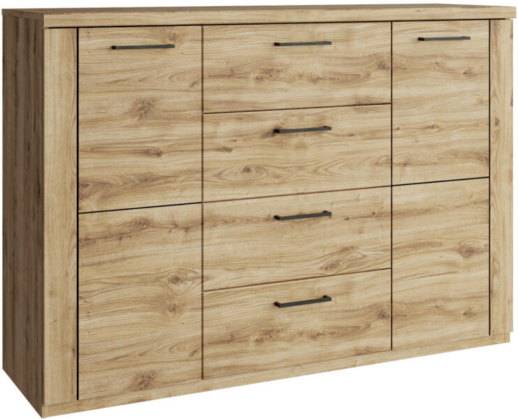 "Komód DORSI 2D4S Anyag: laminált DTD/MDF Szín: navarra tölgy Méretek (SzxMéxMa): 135x41x 94,6 cm Anyag vastagsága: 1,6 cm Kétajtós Polcos Négy fiók Fiók méretei (SzxMa): 54,6x21,6 cm Műanyag fogantyúk Fogantyúk színe: fekete Modern dizájn