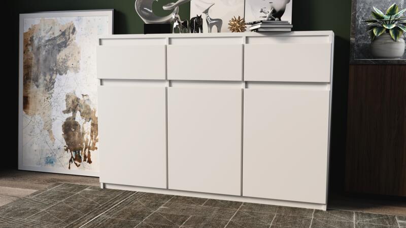 Merg 3S3F 3 ajtós - 3 fiókos komód fehér színben A komód nagyszerű választás nappaliba, étkezőbe vagy a hálószobába. A szekrény kombinálható sok más bútorral. Kivitel: fehér Méretek: Magasság: 85 cm Szélesség: 120 cm Mélység: 33 cm Fiókok mélysége: 30 cm  - Mindigbútor