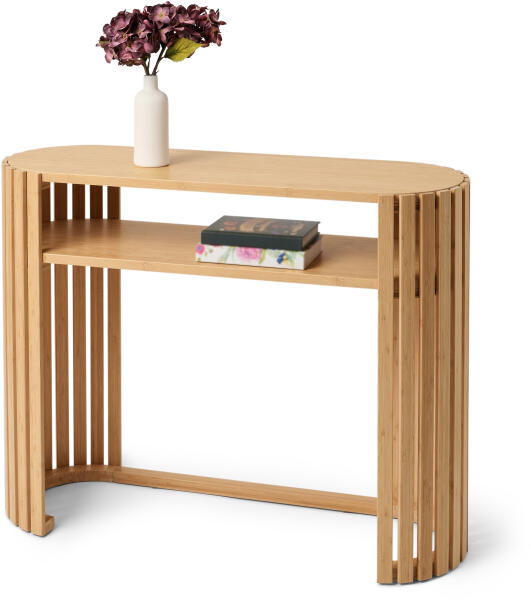 HOLT konzol, bambuszból, lamellás elemekkel Szín: Natúrszínű bambusz Anyag: Lakkozott, FSC minősített bambusz Porbevonatos acél vasalatok Méretek: Szé x ma x mé: kb. 100 x 76 x 35 cm Felső tárolófelület: kb. 97,5 x 32,7 cm Nyitott rekesz magassága: kb. 14,7 cm Tartalom: Padlóvédő betétekkel, szerelési anyaggal és útmutatóval Teherbírás: Felső tárolófelület: max. 10 kg Nyitott rekesz: max. 5 kg Műszaki adatok: 1 tárolófelület, 1 nyitott tárolórekesz Egyéb megjegyzések: A terméket lapraszerelten szállítjuk Kiszállítás 1 csomagban HOLT bútorcsaládunk tagjaVáltozatosan kombinálható a bútorcsalád további elemeivelSok tárolóhely a 2 tárolófelületen FSC® minősített tömör bambuszFali rögzítéssel