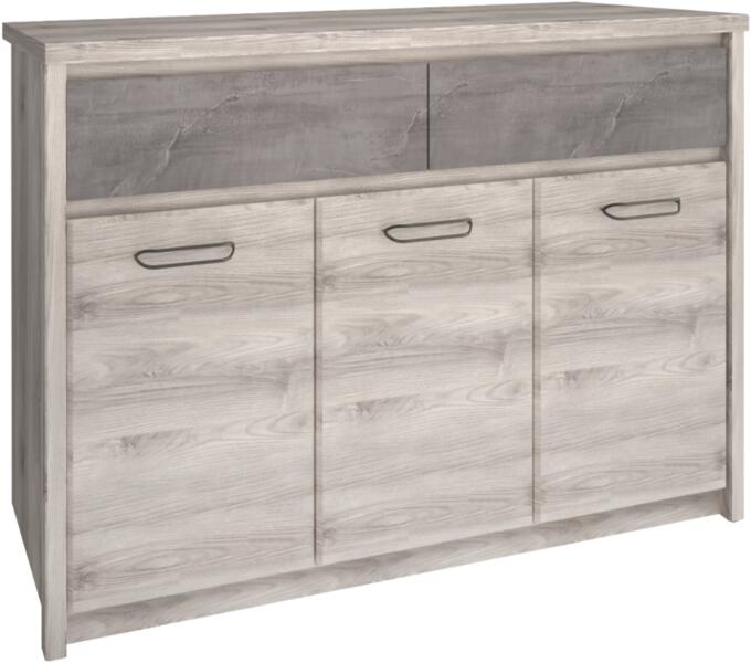 Szobák > Nappali szoba bútor > Komód - Anyag: laminált DTDSzín: nairobi gesztenye/onixMéretek (SzxMéxMa): 126,6x95,2x40,3 cmAnyag vastagsága: 1,6-3,2 cmMűanyag lábakFém fogantyúkFogantyúk színe: feketeHáromajtósKét fiókFiók teherbírása: 5 kgModern dizájnSzétszerelve szállítva