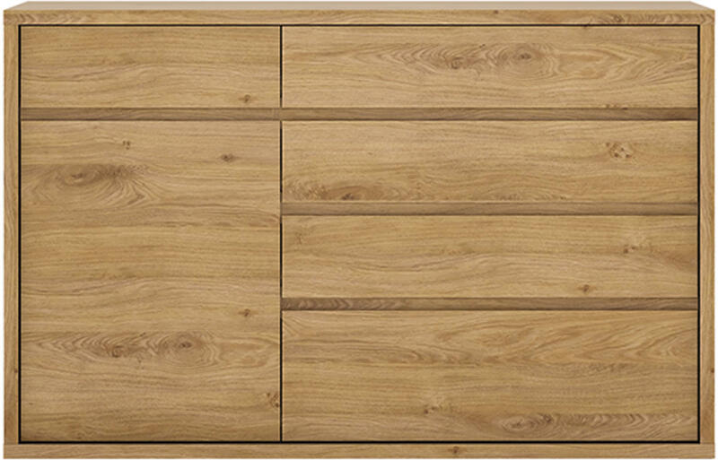 Anyag: laminált DTD Színkivitel: shetland tölgy/szürke Méretek (SzxMéxMa): 136x40x86,8 cm Korpusz vastagsága: 2,8 cm Fogantyúk nélkül Egyszerű a elegáns Vastag korpusz 5 fiók 1 polc 1 egyajtós szekrény modern stílus Kiváló minőség Precíz kidolgozás Ellenáll a karcolásoknak, az UV sugárzásnak, a magas hőmérsékletnek Polc teherbírása: 5 kg Fiók teherbírása: 5 kg Bontásban szállítva