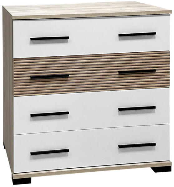 Texas 4 fiókos komód – Praktikus tárolás stílusos megjelenéssel A Texas 4 fiókos komód kiváló választás mindazok számára, akik egy megbízható, strapabíró, mégis elegáns tárolóbútort keresnek. Letisztult formavilága és markáns színkombinációja a természetességet és a modern dizájnt ötvözi. A komód a Texas bútorcsalád részeként tökéletesen illeszkedik a hozzá tartozó szekrénysorhoz, polcos elemekhez és egyéb kiegészítőkhöz – így akár komplett nappali vagy hálószoba összeállítás is kialakítható. Főbb jellemzők