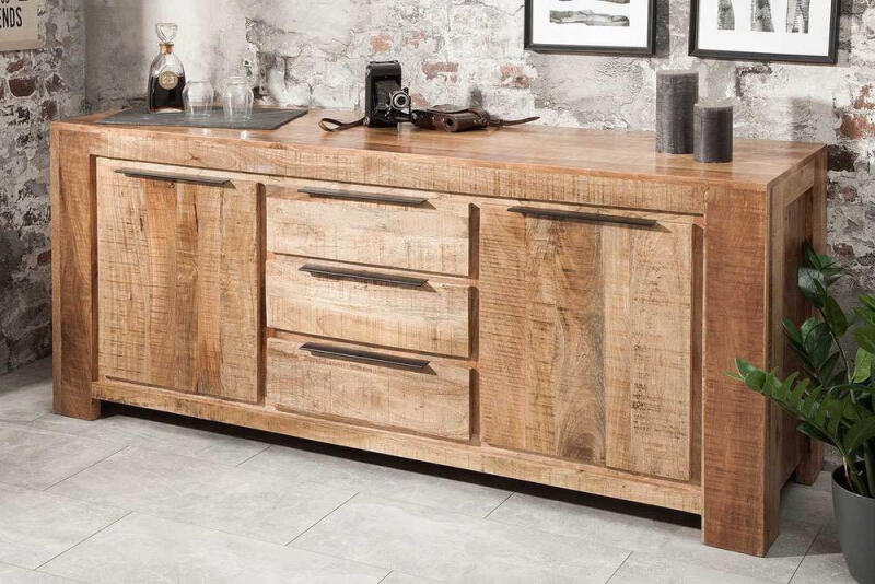 A tömör mangófából készült Thunder komód egy darab természetet visz otthonodba. A lenyűgöző mangófa jellegzetes erezetével és a fára jellemző, meleg árnyalataival azonnal magára vonja a tekintetet. A letisztult formavilágú, feketére színezett fém fogantyúk modern kontrasztot alkotnak a természetes fával, így a bútor egyszerre sugároz természetességet és kortárs eleganciát. Különlegessége, hogy minden darabot kézzel nemesítenek, így mindegyik igazi egyedi alkotás. A komód nemcsak designjával nyűgöz le, hanem rendkívüli funkcionalitásával is. Három nagyméretű fiók és négy tágas rekesz biztosít bőséges helyet minden otthoni kellékednek. A széles felső lap tökéletes felületet kínál dekorációk vagy fényképek stílusos bemutatására. Tedd az enteriőröd igazán harmonikussá az azonos kollekcióhoz tartozó étkező- vagy dohányzóasztallal kombinálva!